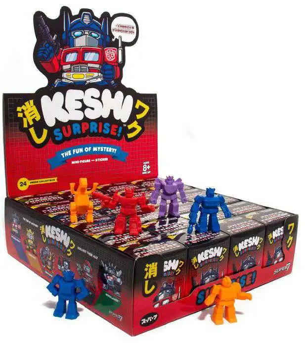 Transformers Autobot Keshi Surprise 1.75″ Figure Blind Box. Each box contains a random figure (Optimus Prime, Bumblebee, Grimlock, Jazz, Ironhide, or Wheeljack) and an exclusive foil sticker of that character. NYCC Debut..