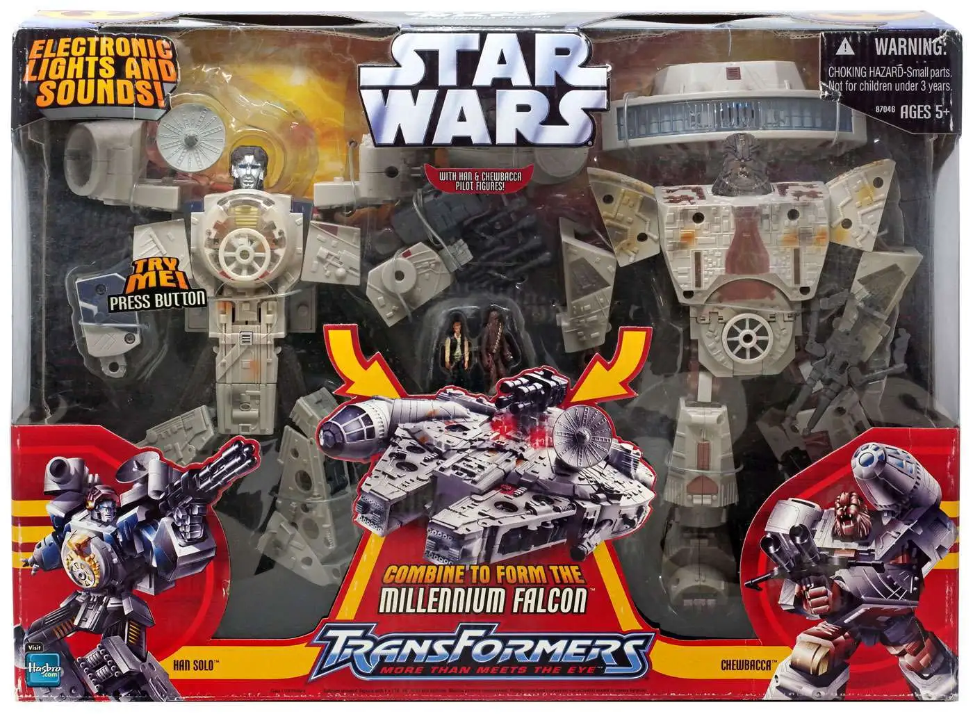 Hasbro is applying the awesome technology of the TRANSFORMERS brand to your favorite Star Wars characters and vehicles! This intense boxed 2 pack of giant Han Solo and Chewbacca robots combine to form the mighty Millenium Falcon! Features firing missiles and turret cannons that become handguns!