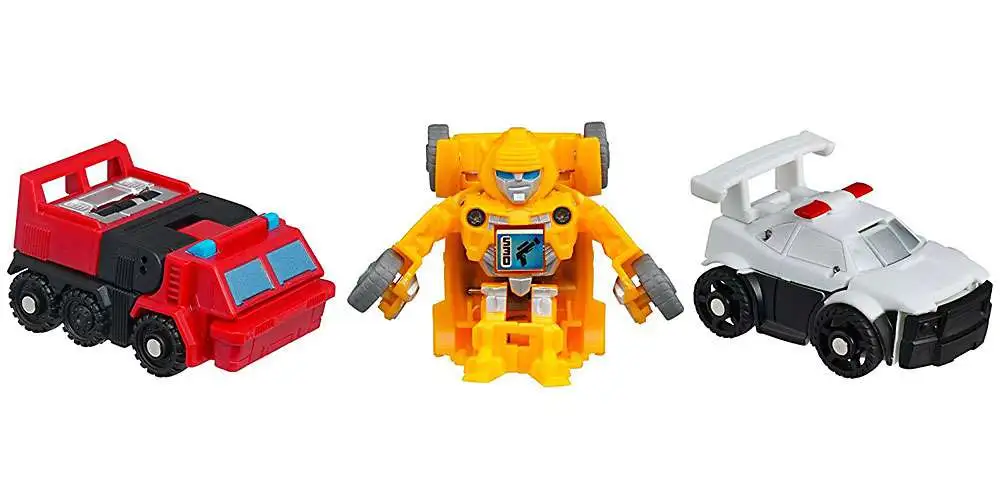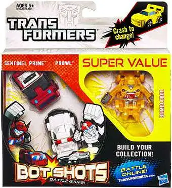 Its a game of strength and high-powered collisions with this intense TRANSFORMERS BOT SHOTS Battle Game! Each of these BUMBLEBEE, SENTINEL PRIME and PROWL vehicles has a Sword, Blaster and Fist power. Choose your vehicle and its power, and face off against an opponent. Crash your vehicles by rolling them at each other! If your vehicle converts to robot mode while your opponents stays in vehicle mode, you win! If neither vehicle converts, crash them again! If its a tie, the vehicle with the highest power wins. Blaster beats Fist, Fist beats Sword and Sword beats Blaster. May the strongest BOT SHOT vehicle win!