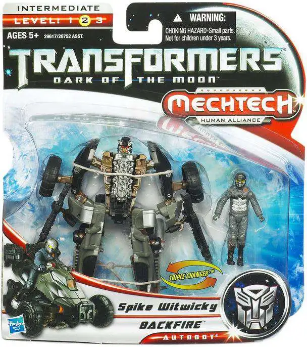 BACKFIRE and his human ally have much to gain but even more to lose. Can they trust each other? More importantly can they afford not to? Dont waste time deciding. Switch into three-wheeler mode, sit Spike Witwicky on top, and send them into battle. Or let your human ally figure take refuge behind his mechanical friend when hes in robot mode. You can even switch to weapon mode and add on any other MECHTECH figure! (Sold separately.)