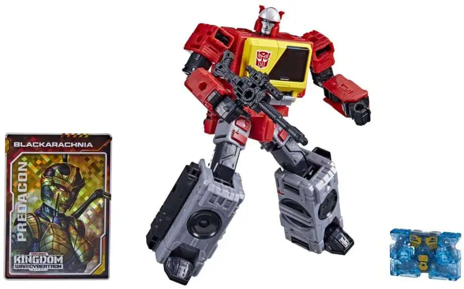 Beastify the battlefield! Worlds collide when the Maximals and Predacons join the fight, coming together with the Autobots and Decepticons in an epic battle that will alter their destiny forever. Primal power floods the battlefield as the fierce beast modes of the Maximals and Predacons are unleashed! With the ancient and highly advanced F.O.S.S.I.L. (Fossilized Osteo-Skeletal Shield Integration Loadout) technology, Fossilizer bots, infused with primordial energy, break apart to weaponize their allies. Use Deluxe Fossilizer figures to beastify the Autobot Blaster figure with bone armor! (Sold separately, subject to availability.) This G1-inspired toy converts into radio mode in 20 steps and comes with a blaster accessory. Eject figure converts from robot to cassette mode in 8 steps. Includes a Golden Disk card that reveals a possible destiny of a key character. Collect other Kingdom figures to reveal all 3 alternate destiny variants for each character!