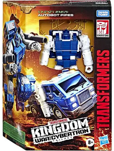 Beastify the battlefield! Worlds collide when the Maximals and Predacons join the fight, coming together with the Autobots and Decepticons in an epic battle that will alter their destiny forever. With the ancient and highly advanced F.O.S.S.I.L. (Fossilized Osteo-Skeletal Shield Integration Loadout) technology, Fossilizer bots, infused with primordial energy, break apart to weaponize their allies. Use Deluxe Fossilizer figures to beastify the Autobot Pipes figure with bone armor! (Sold separately, subject to availability.) This G1-inspired toy converts into Earth mini truck mode in 17 steps. Features translucent windows and 2 pipe blaster accessories that attach to each forearm in robot mode and as pistons in truck mode. Includes a Golden Disk card that reveals a possible destiny of a key character. Collect other Kingdom figures to reveal all 3 alternate destiny variants for each character!
