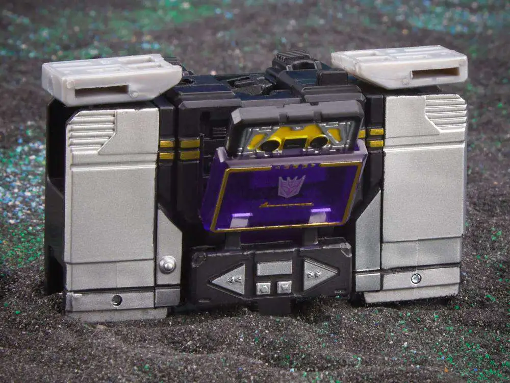Attach cool weapon accessories to the Soundblaster action figure. Comes with shock blaster and shoulder cannon accessories. Also includes a non-converting Buzzsaw cassette tape accessory that can fit inside the Soundblaster figure in cassette player mode. Stands about 3 1/2-inches tall. Ages 8 and up.