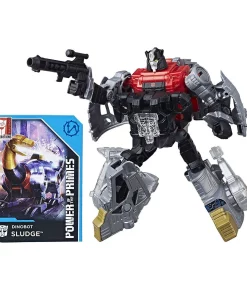 Transformers Generations Power of the Primes Deluxe Class figures are 5.5-inch-scale figures that come with a Prime Armor accessory. Insert a Prime Master figure (not included, each sold separately) into the accessory, attach it to the figure’s chest, and imagine Dinobot Sludge wields the power of a Prime.