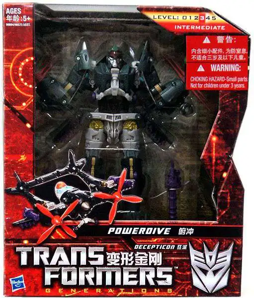 Gear up for awesome robot-to-vehicle action with this intimidating POWERDIVE figure! In robot mode his spinning blade weapons give him the edge when he plunges into battle against his AUTOBOT enemies. But when he needs to take the battle off the ground, convert him to twin-engine bomber mode! Keep converting him back and forth so he can handle whatever his enemies throw at him!