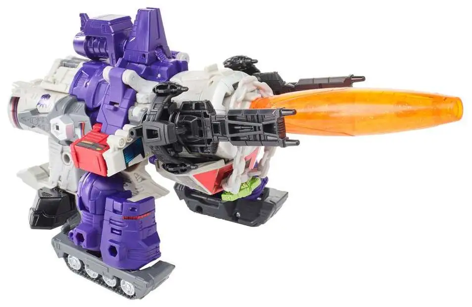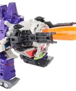 Behold, Galvatron! The herald of Unicron blasts his way into the Generations Selects line with this special edition figure! This Galvatron figure is inspired by the classic 1986 toy release, featuring comic-inspired deco. Includes 2 weapon accessories and the classic green Matrix of Leadership accessory on a chain that can be worn around the figures neck. This Galvatron figure converts from robot to Galactic Cannon mode in 33 steps. Comes with a sheet of foil labels, including a heat-sensitive sticker that reveals the Decepticon shield when you rub it with your finger.