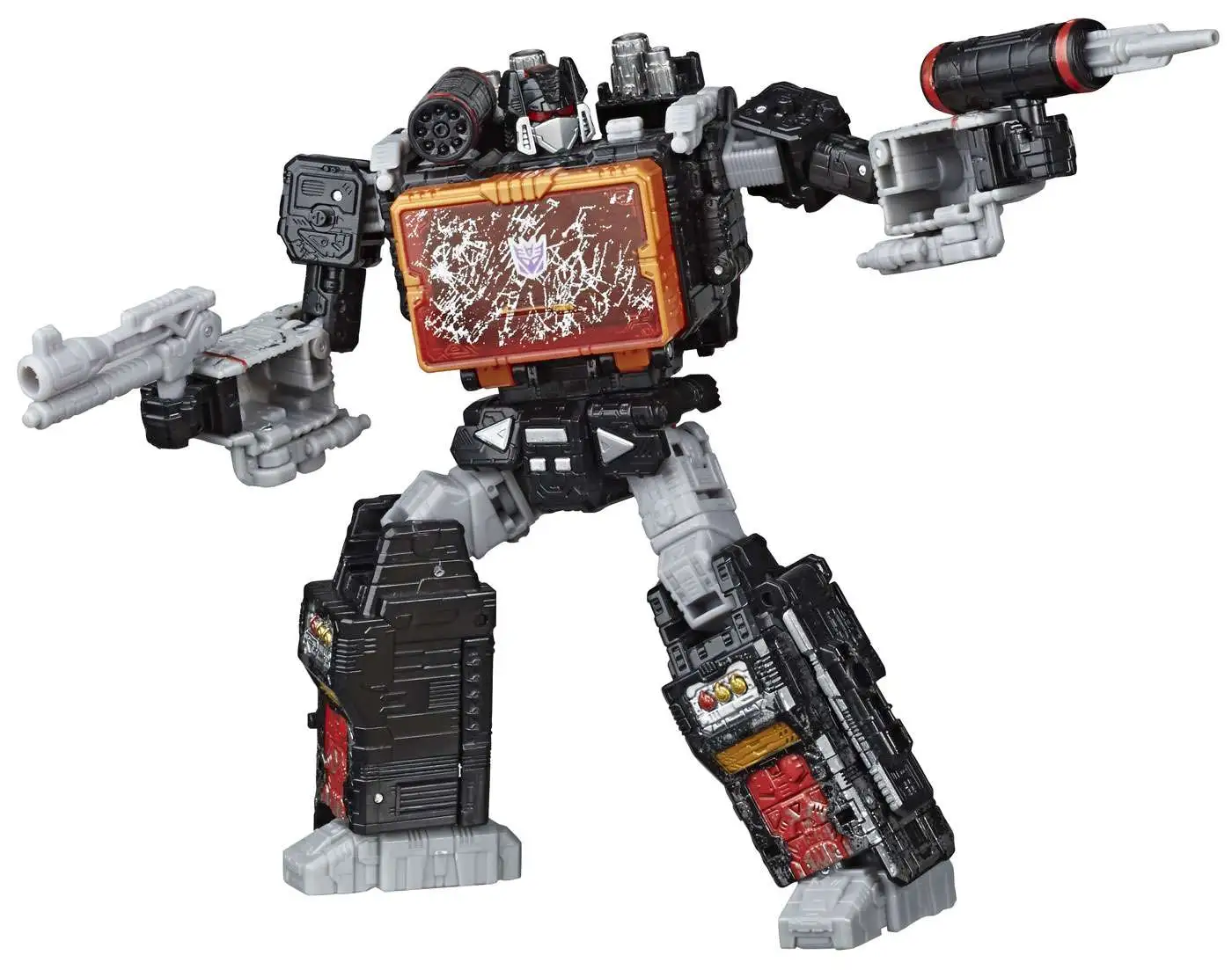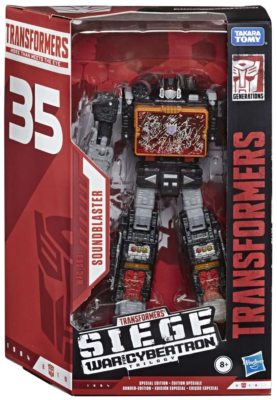 Build the ultimate battlefield with Siege figures. Siege plunges fans into the epic fight to survive on the final day of the Autobot and Decepticon battle to control Cybertron. The Decepticon resistance army and the Autobot counter-resistance fighters gear up with the C.O.M.B.A.T. (Cybertronian Omnifuctional Modular Battlefield Assault Tech) System, the universe’s most advanced modular weaponry — including the Decepticon army sergeant and arms dealer, Soundblaster.