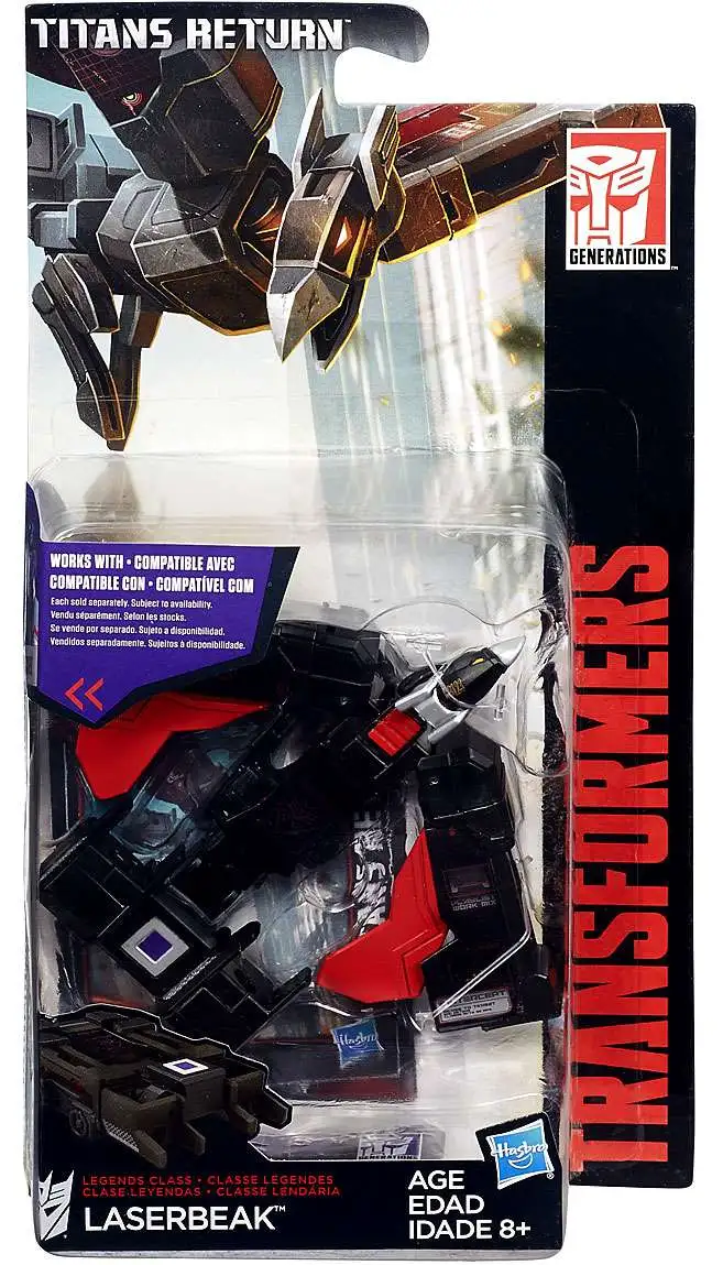 Titans Return Legends Class figures deliver exciting Transformers conversion play in a smaller scale. This Laserbeak figure is a Triple Changer figure that converts from beast mode to vehicle mode to spy tablet mode. In spy tablet mode, the figure fits inside the chest compartment of the Titans Return Leader Class Soundwave figure. (Sold separately. Subject to availability.) The figure changes from beast mode to vehicle mode in 7 steps, and from vehicle mode to spy tablet mode in 6. Also includes a collectible character card with character art on the front and tech specs on the back.