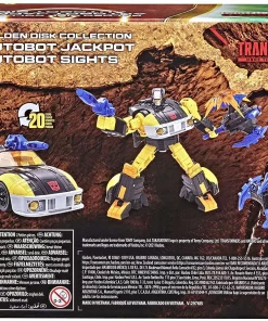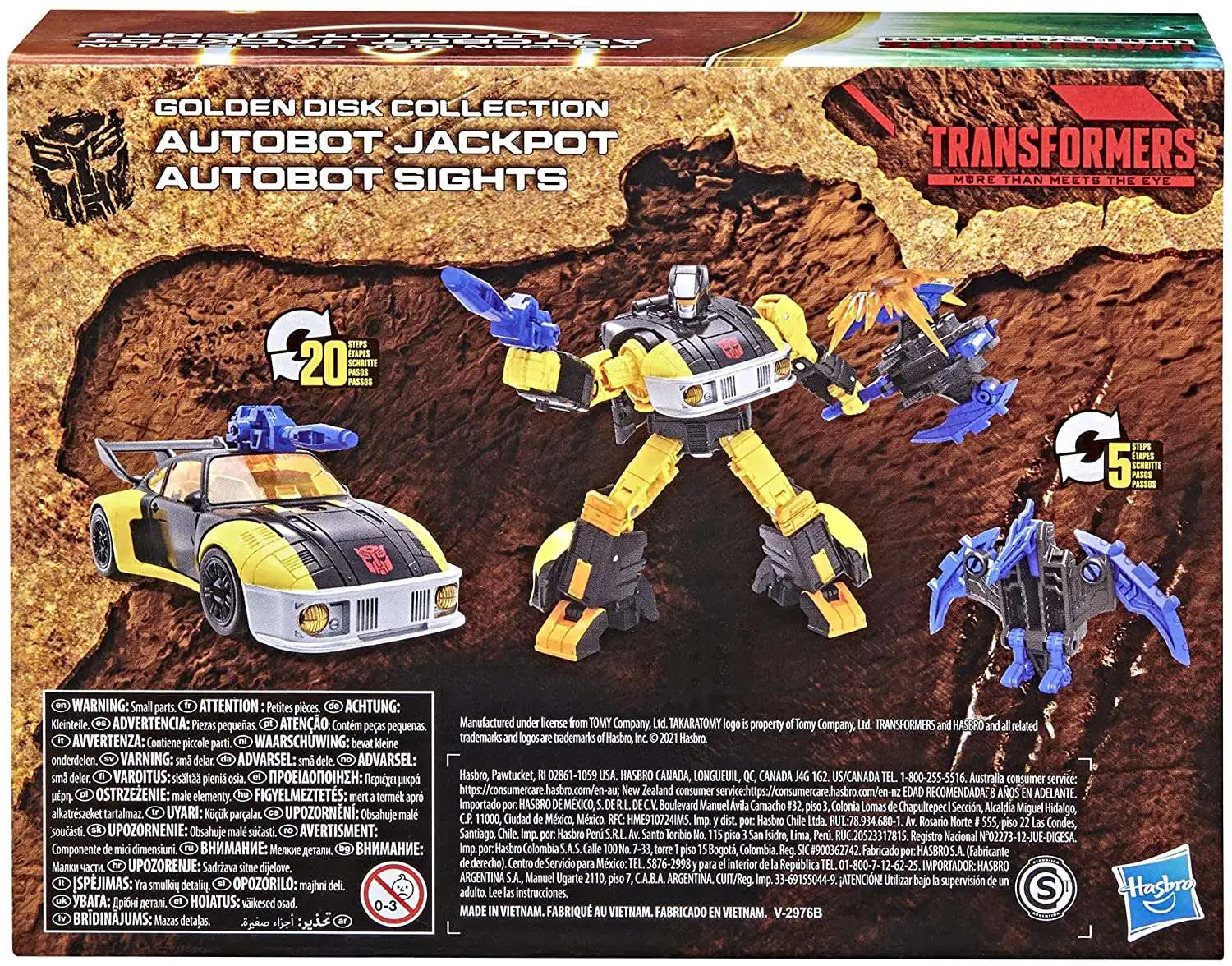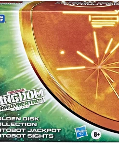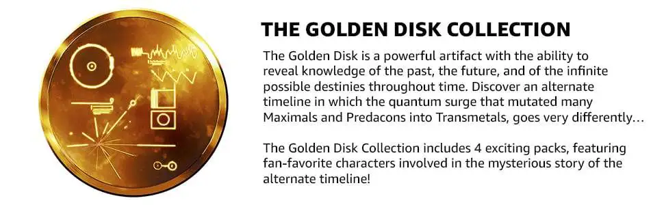 The Golden Disk is a powerful artifact with the ability to reveal knowledge of the past, the future, and of the infinite possible destinies throughout time. Discover an alternate timeline in which the quantum surge that mutated many Maximals and Predacons into Transmetals, goes very differently The quantum surge causes a time vortex, intercepting the Action Master Jackpot and his partner Sights, pulling them through time and space to prehistoric Earth. During the journey through the vortex, Jackpot gains the ability to convert into a vehicle mode for the first time while Sights gets a new alt mode! Autobot Jackpot and Autobot Sights figures convert to sports car and axe modes in 20 and 5 steps. Autobot Jackpot comes with a blaster accessory that also mounts on his vehicle mode. Autobot Sights comes with a blast effect for his axe mode. The Golden Disk Collection includes 4 exciting packs, featuring fan-favorite characters involved in the mysterious story of an alternate timeline!
