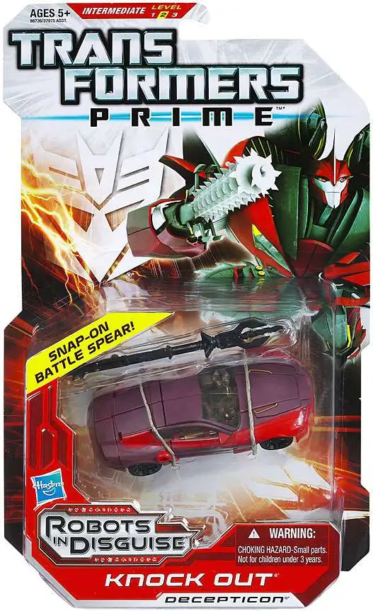 KNOCK OUT is oily slick; the ultimate salesman. Everyone knows his weapons are dangerous and prone to malfunction, and his installation methods often leave DECEPTICONS* scarred or crippled. But who can resist having quantum disintegration at his fingertips? Your fierce KNOCK OUT figure is ready to make big trouble for the AUTOBOTS*! In robot mode, your KNOCK OUT figures snap-on battle spear is dangerous enough, but when he needs the element of surprise, it splits into twin battle spikes! Convert him to sports car mode when the weapon he needs is speed! Keep converting him back and forth so he can handle whatever his enemies throw at her! Swindle your way to ENERGON riches with the slick DECEPTICON scientist! Spear snaps on to robot mode! Spear splits into twin battle spikes!