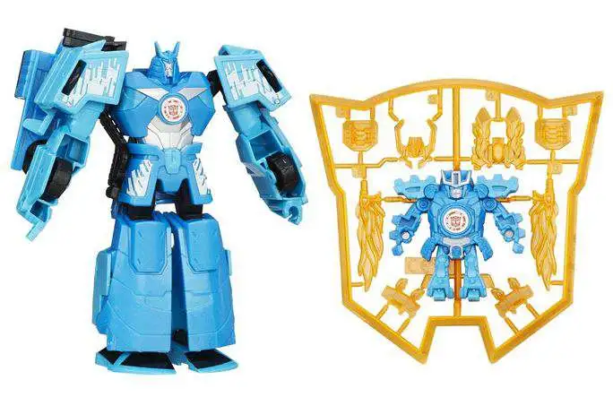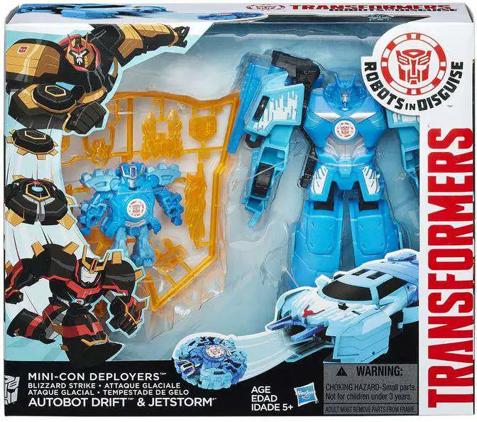 Get a dynamic duo of Mini-Con fighters with these awesome Autobot Drift and Jetstorm figures! Your Jetstorm figure is a small but mighty fighter who converts in 1 step from covert mode to warrior mode with a terrifying blade attack. But his Autobot Drift buddy is a Mini-Con Deployer who can launch Jetstorm into battle when hes in robot mode! Kids can scan the Autobot Drift figures badge and unlock the character in the Transformers: Robots in Disguise app (device not included). With these Autobot fighters working together, Decepticons dont stand a chance!buy = ‘Y’;