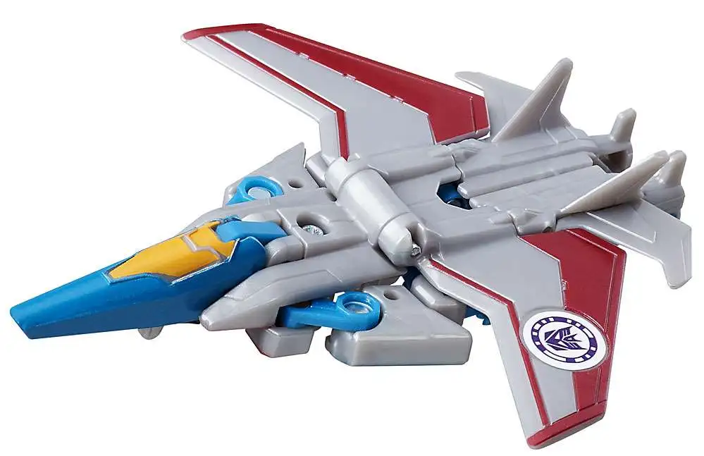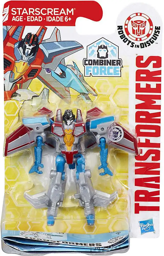 Collectible Transformers: Robots in Disguise Combiner Force Legion Class figures, are smaller-scale figures that feature classic Transformers conversion. Change this Legion Class Starscream figure between robot and jet in 5 steps. Scan the Decepticon shield on this Starscream figure to unlock a token in the mobile app (see below for app details). Collect other Legion Class figures and create your own Autobot vs. Decepticon battles (Each sold separately. Subject to availability.)