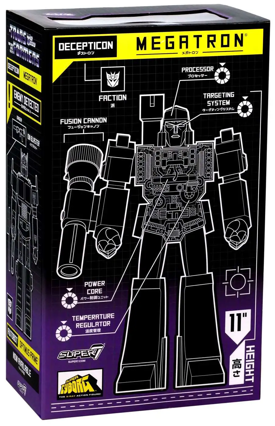 The evil leader of the Decepticons is a Generation One Cartoon-Accurate 12″ poseable action figure with fusion cannon and removable chest plate, showcasing his robotic innards. This X-Ray edition Super Cyborg Megatron is cast in clear plastic with painted inner torso, and packaged in a deluxe window box.