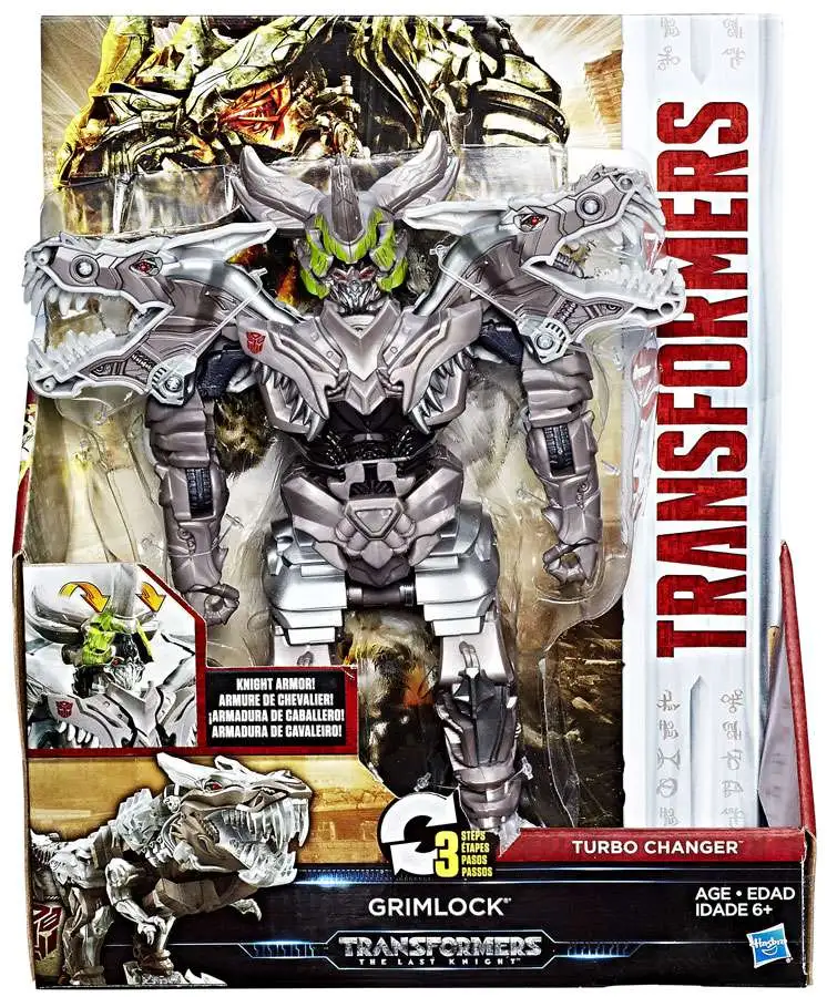 The explosive Transformers saga continues with Transformers: The Last Knight. With the fate of Earth at stake, new heroes must rise in an epic struggle to forge a future for all. Join the action and experience the thrill of quick conversion with Transformers: The Last Knight — Knight Armor Turbo Changer figures. Switch this Turbo Changer Grimlock figure from robot to T-rex mode in 3 exciting steps. Flip the knights helmet over the figures head in robot mode to activate Knight Armor. Imagine charging into battle with this Transformers: The Last Knight — Knight Armor Turbo Changer figure. Grimlock is a rampaging beast of destruction who leads the ferocious Dinobots. He is one of the most powerful warriors in the universe. All those on the side of evil should fear the thundering strength of Grimlock.